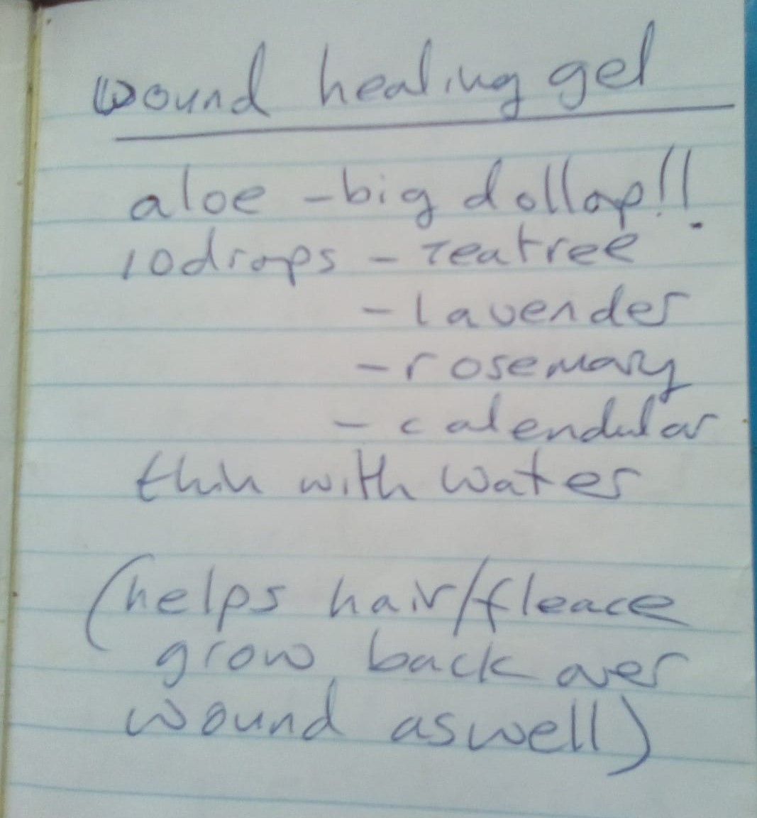 Topical applications of aloe vera gel can be used to soothe and heal skin irritations, cuts, and wounds in animals, especially when mixed with herbs such as calendula and essentail oils such as lavender - see pic for recipe kindly supplied by Sheep Farmer Lynnie Hutchison. It can also be used as a lubricant for prolapses.