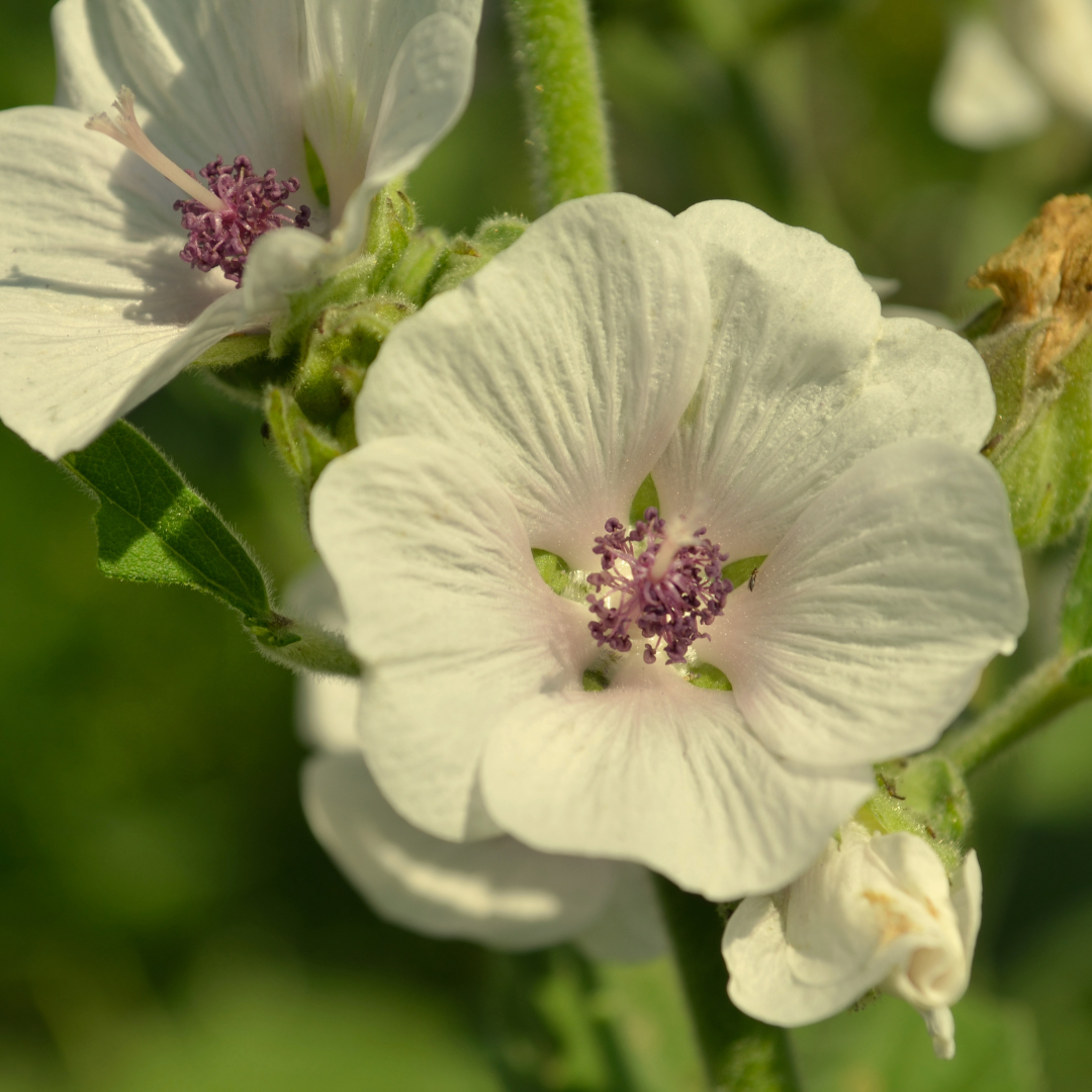 Althaea officinalis, commonly known as marshmallow, is a perennial herbaceous plant belonging to the Malvaceae family. Native to Europe and western Asia, marshmallow is now cultivated worldwide for its medicinal and culinary uses. It has a stout, upright stem with broad, ovate leaves that are velvety and softly hairy. Marshmallow produces pale pink or white flowers with five petals in axillary clusters. The root of the marshmallow plant is thick, long, and tapering, with a whitish exterior and a fibrous, mucilaginous interior.